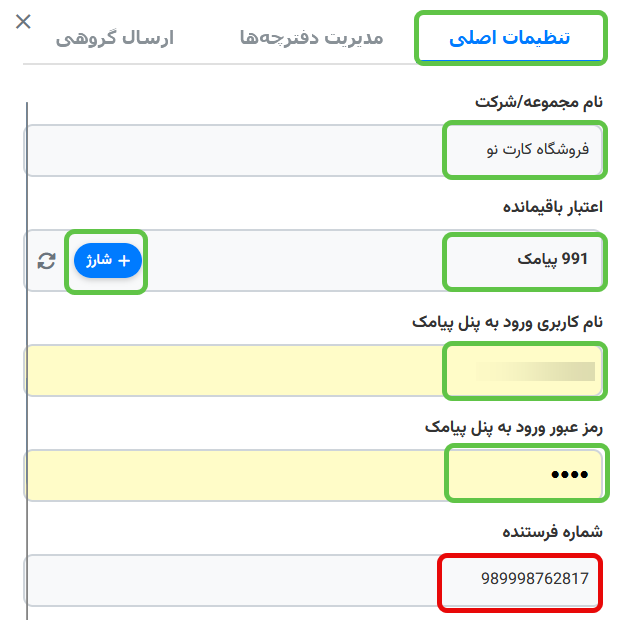 توجه: نام کاربری نرمافزار با پنل پیامکی یکسان است و نباید تغییر کند