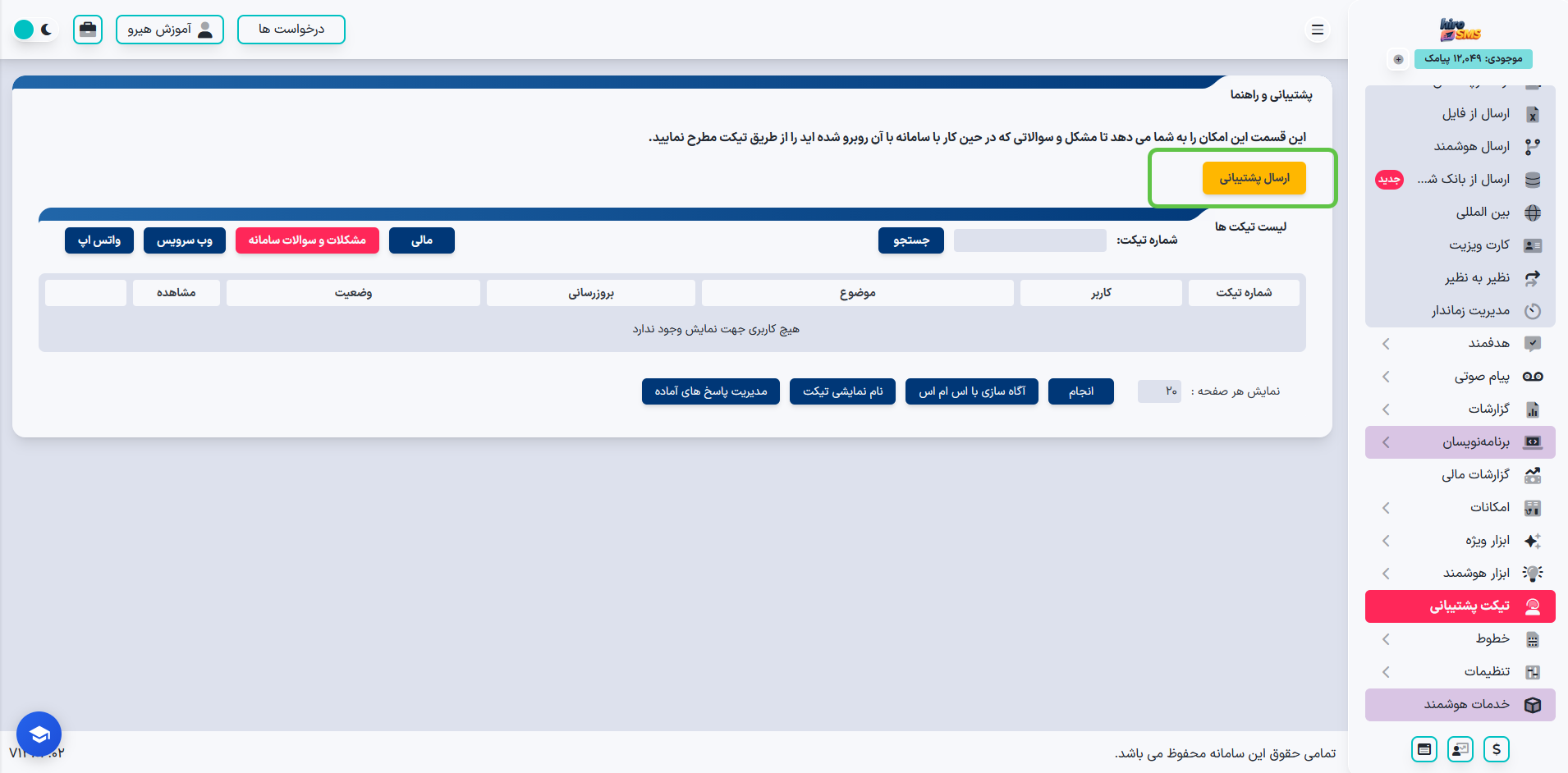 جمعبندی، ارسال تیکت پشتیبانی در پنل پیامکی هیرو